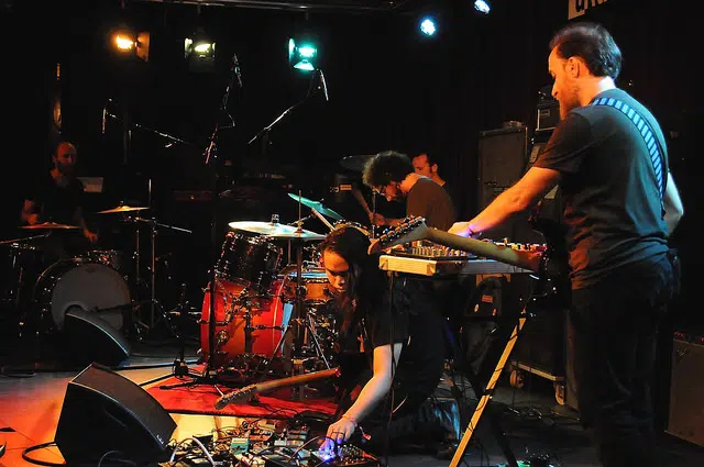 Aidan Baker is artist in residence op Incubate 2014. Vanavond treedt hij, samen met Thisquietarmy (Eric Quach) en drie drummers, aan als Hypnodrone Ensemble. Als we bij Paradox aankomen, staat er zowaar een rij gegadigden die slechts mondjesmaat worden binnengelaten. Wanneer het ons na een kleine tien minuten dan toch lukt is om binnen te geraken, treffen we Quach aan die in een waar gevecht is gewikkeld met zijn assortiment pedalen. Baker – de effecten netjes in een flightcase op statief voor zich – en de drummers leggen een machinale groove neer, terwijl Quach de ene verwoede poging na de andere onderneemt om zijn effecten aan de praat te krijgen. Ergens in het kluwen aan kabels en pedalen zit er een fout, maar het duurt pijnlijk lang voor het euvel opgelost is. En dan is er dus nog tijd voor één afsluitende track, die – dankzij de mooie klanktapijten van Quach en Baker, maar zeker ook dankzij het als een driekoppig monster groovende drumtrio – het pijnlijke schouwspel toch nog doet vergeten. Niet zo voor Quach, echter, want we horen later dat de man bepaald niet kon lachen om zijn falende setup. (sb)