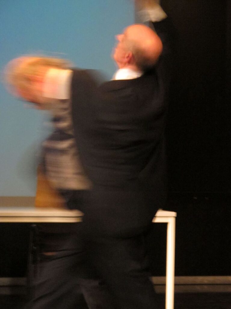Plotseling stopt het geluid. Een zalige, fysiek voelbare stilte daalt neer, en de heren zitten weer kalm. Dan staan ze op, lopen elk naar een andere kant van de zaal waar een stapeltje stoelen al staat te wachten. Ze beginnen de stoelen over de vloer te schuiven, de ruimte verkennend, lijkt het wel. Het geschuif brengt veel gepiep en geknars teweeg. Met de stoelen als instrumenten begint het duo een stuk abstracte muziek te improviseren. Wild knarsend, schurend en piepend razen de heren over de vloer van de ruimte, totdat ze met veel vaart tegen elkaar knallen.